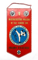 Стан: ДОБРЕ: Оригінальний вимпел із тканини, ламінату та паперу, виданий з нагоди 5-го Чемпіонату Польщі з таеквон-до, який відбувся 8-9 листопада 1986 року в Любліні. На вимпелу є назва та дата змагань, а також знак комісії тхеквондо Польської асоціації карате. З іншого боку зображено герб Польської Народної Республіки на фоні біло-червоного кольору.