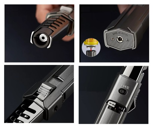 Представляємо запальничку/пальник. Запальничка має блокування від випадкового спрацьовування і газовий кран. Наконечник пальника має металеву кришку для захисту від високих температур.
