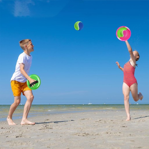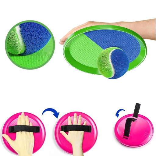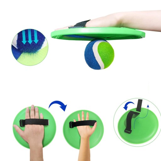 - Ідеальний баланс липких кульок на липучці та ручки весла, достатньо липкої, щоб з легкістю зловити м’яч. Однак дістати м'яч з тарілки для малюка не складе труднощів. Виготовлений з екологічно чистого ПЕ, без запаху та надзвичайно безпечний для ваших дітей.