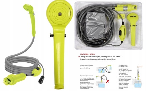 Переносний душ обладнаний електричним насосом. Корисно для кемпінгу, бівуаків і місць без доступу до ванної кімнати. 2-метровий шланг і 4-метровий шнур живлення забезпечать великий робочий діапазон.
