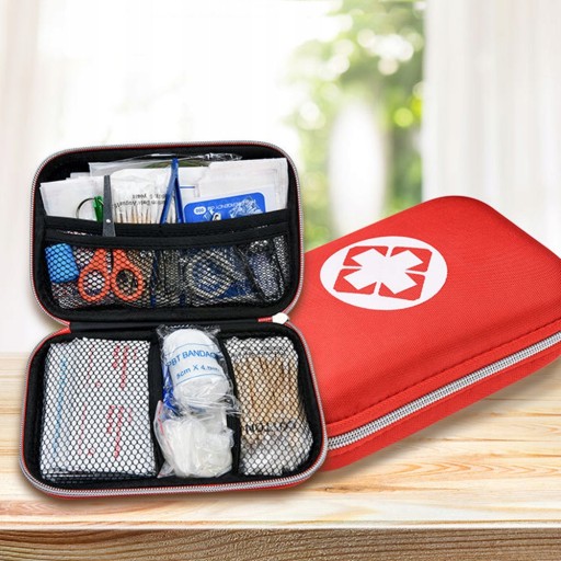 Аптечка на 184 предмети включає ножиці, плоскогубці, бинт, лейкопластир, джгут, ватний тампон, йодний тампон, лейкопластири, респіраторну мембрану, ковдру та сумку для зберігання.