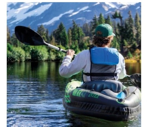 Яскраво-зелений колір і спортивна графіка роблять його добре помітним у воді. Він виготовлений з міцного та довговічного вінілового матеріалу - SuperStrong PVC - забезпечує чудову довговічність, високу стійкість до ударів та стирання. Він має обтічний дизайн, який полегшує веслування. Підлога в байдарці надувна, а для комфорту використання вона оснащена надувним сидінням зі спинкою.