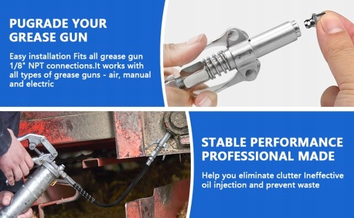 Сумісний з усіма мастилками зі з’єднанням 1/8" NPT. Насадка мастильниці підходить для всіх кранів 1/8" NPT, пневматичних, ручних мастилок і фітингів Zerk, а також підходить до всіх мастилок DIN і SAE. Покращена щелепа може працювати під високим тиском без деформації.