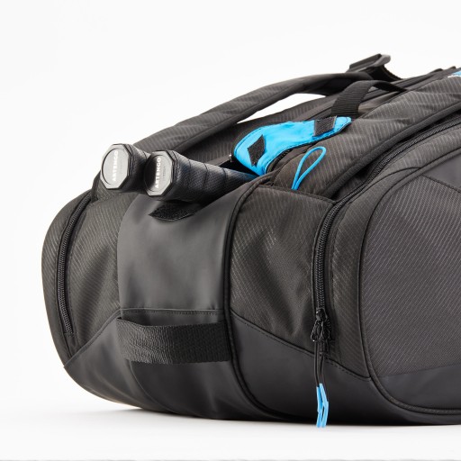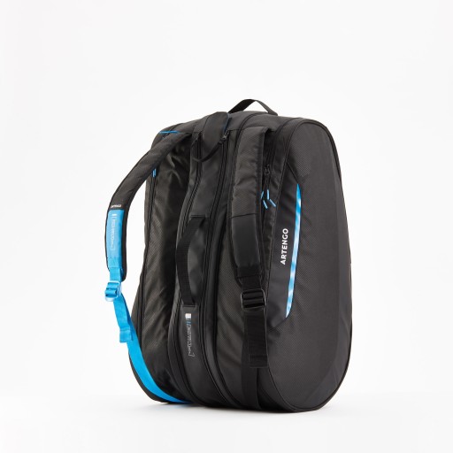 Центральна кишеня на блискавці дозволяє носити одну або кілька ракеток. Дві великі бічні кишені дозволяють носити взуття, одяг та інші аксесуари (їжа, рушник, м'ячі або сітки, пляшка з водою тощо), залежно від ваших потреб. Ви також можете розділити чистий і брудний одяг після сеансу. Невелика кишеня на блискавці на зовнішній стороні сумки дозволяє зберігати мобільний телефон, ключі, гаманець або інші дрібні аксесуари.