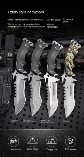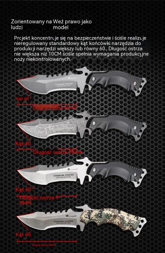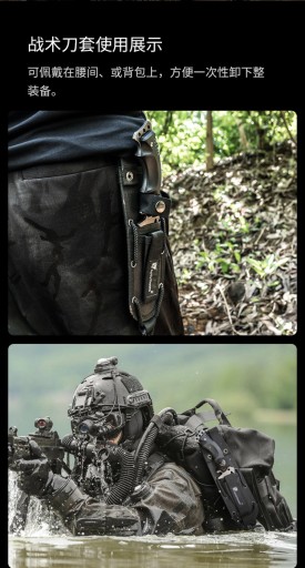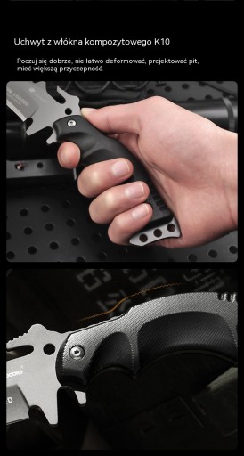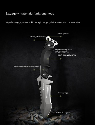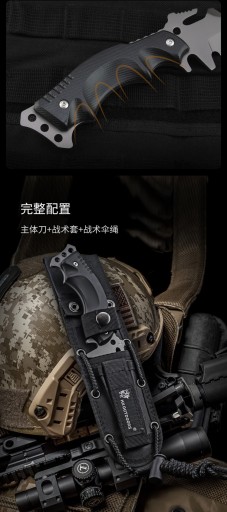 Лезо виготовлено з нержавіючої сталі марки 440, яка має високу твердість, що робить інструмент стійким до корозії та зносу. Рукоятка ножа виготовлена з протиковзкого композитного волокна К10, а на хвостовику є отвір для мотузки. , що дозволяє легко виготовляти списи, гарпуни тощо.