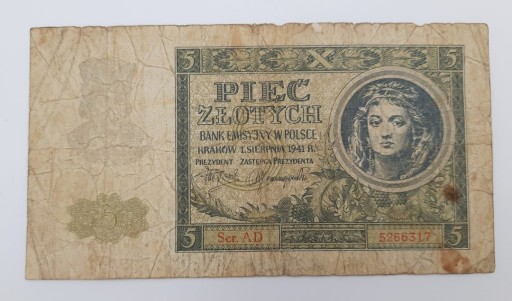 Стара колекційна банкнота Польща 5 злотих 1941 р