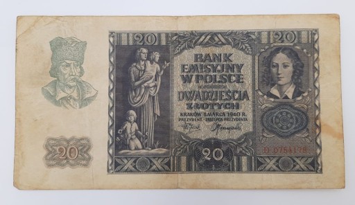 Стара колекційна банкнота Польща 20 злотих 1940 р