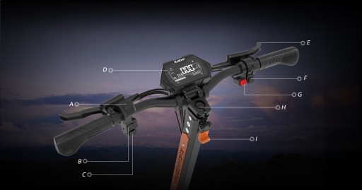 - РК-дисплей: швидкість, запас ходу, передача, потужність, акумулятор, покажчик повороту, символ перевірки фар