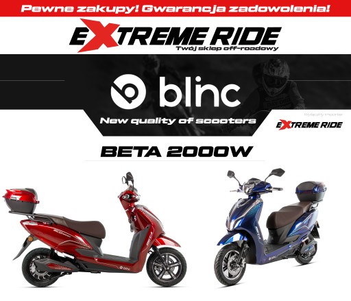 BLINC BETA - це остання лінія електричних скутерів на польському ринку. Зручність використання прихована в красивій формі. Скутер оснащений електродвигуном потужністю 2000 Вт. Він живиться від комплекту акумуляторів 72V20Ah. Він встановлений на 12-дюймові колеса. У стандартну комплектацію входить задній багажний відсік і відсік для речей під сидінням.