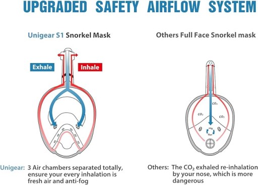 На відміну від інших масок для підводного плавання, які мають лише 2 канали або підключені, наша нова маска для підводного плавання має 3 повністю розділені повітряні канали, які можуть запобігти повторному вдиху CO2, гарантуючи, що з кожним вдихом буде свіже повітря, а не старе повітря, яке спричиняє запаморочення та навіть задуха.