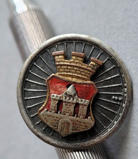 Триелементний знак, викарбуваний з матриці, більший елемент виготовлено з посрібленої латуні, середній позолочений червоною емаллю, останній у вигляді герба зі срібла.