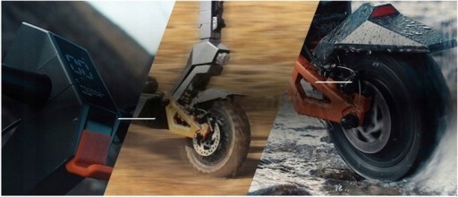 KuKirin G1 Pro використовує передні та задні дискові гальма з хорошою вентиляцією та розсіюванням тепла та покращеним гальмуванням; Відразу в умовах бездоріжжя полігон на високих швидкостях, легко закривається, відразу рушає з місця.