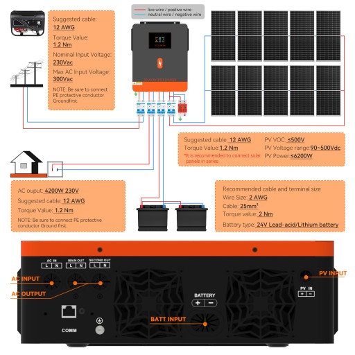 Гібридний інвертор PowMr 4,2 кВт, включений/вимкнений, 24 В постійного струму 230 В змінного струму Сонячна панель Початкова напруга 60 В постійного струму Чиста синусоїда Сонячний інвертор 120 А Сонячний контролер RGB Light Функція обслуговування в один клік