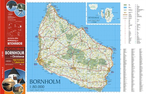 Остання карта датського острова Борнхольм з маршрутами позначених велосипедних маршрутів і розташуванням усіх туристичних визначних пам'яток. Крім того, включено оновлені карти міст Nexø, Rønne, Svaneke, Gudhjem, Aakirkeby, Hasle і Allinge-Sandvig, а також карта архіпелагу Christiansø. Для навігації використовується сітка GPS.