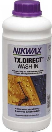 Nikwax Tx Direct - це водонепроникний засіб для одягу від дощу, який можна прати в машині або вручну. Додає водовідштовхувальні властивості та покращує повітропроникність тканин без підкладки.