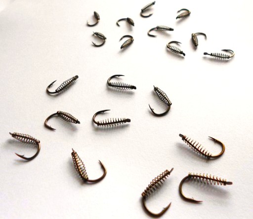 Розмочену дробину насаджую на гачок і надягаю пучок червоних черв'яків, черв'яків також обмотую навколо пружини.
