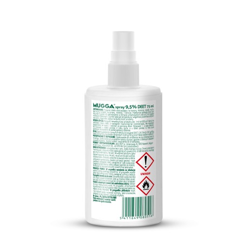 Mugga® Spray не подразнює шкіру та не спричиняє забруднення, але його не слід наносити на порізи, рани чи подразнену шкіру. У разі нанесення на обличчя, спочатку розпиліть руки, а потім розподіліть препарат по шкірі обличчя.