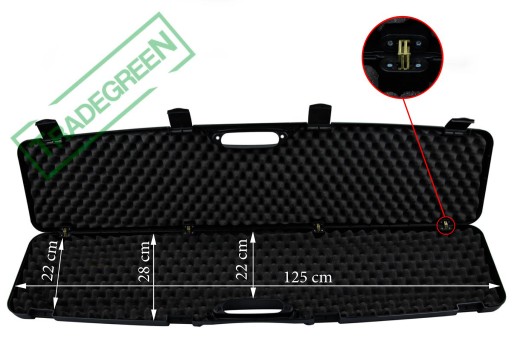 У нього легко поміститься гвинтівка з оптикою, або дробовик чи пневматична зброя. Валіза має два отвори для захисту вмісту (за допомогою замка) від несанкціонованого доступу.