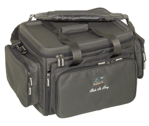 З обох боків сумки є 2 кишені із захисною кришкою Hard Case. Велике основне відділення містить 3 великі органайзери Tackle Chest Large, які відокремлені один від одного відділеннями на липучках; їх можна зняти зверху. Всередині передньої кишені є Rig Carrier з невеликими відділеннями, а також ST-Chest 1, 2 і 3. Передню кишеню можна відкрити за допомогою блискавки або липучки. Жорстку кришку сумки також можна використовувати як столик. Плечовий ремінь з щільною підкладкою, дві ручки та стійка до бруду основа з ПВХ доповнюють особливості сумки Slide In Tray.
