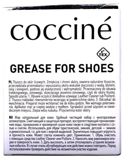 - Продукт, що містить натуральні жири, призначений для повного та безпечного догляду за взуттям, аксесуарами, шкіряним одягом та шкіряними меблями з гладкої зернистої шкіри.