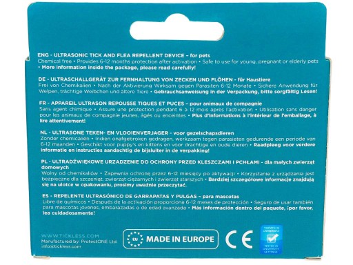 - Водостійкість: волога не пошкоджує пристрій (IP13) - однак слід уникати прямого контакту з водою, оскільки TickLess не є водонепроникним