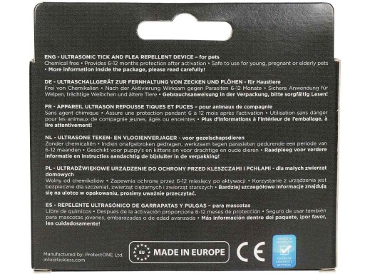 - Водостійкість: волога не пошкоджує пристрій (IP13) - однак слід уникати прямого контакту з водою, оскільки TickLess не є водонепроникним