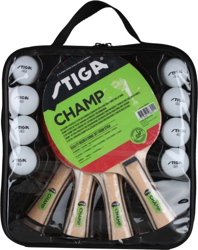 У набір входять чотири ракетки STIGA CHAMP з хорошим контролем і 8 м'ячів STIGA TRAINER. Все це упаковано в зручний футляр.