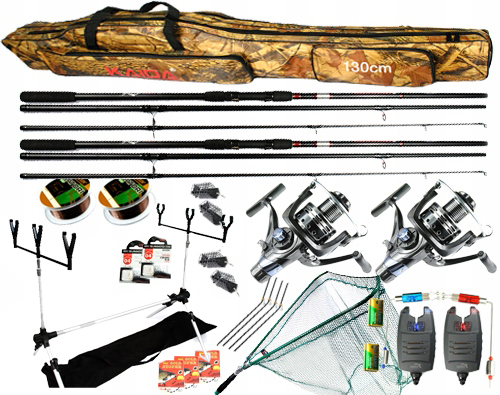 Неймовірно багатий набір, який включає два коропових вудилища JAXON ZAFFIRA 3,6 м, дві котушки FL 5000 8+1 з підшипниками вільної шпулі, коропову підставку на 3 вудилища, короповий підсадок 2,3 м, рибальську сумку 130 см, два індикатори клювання LED LINE разом з електричні свінгери та акумулятори, волосіні та дрібніші аксесуари, необхідні для донної риболовлі.