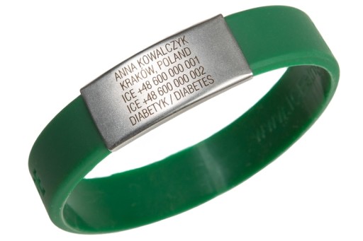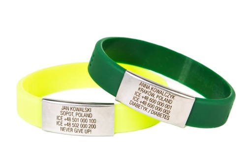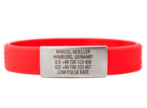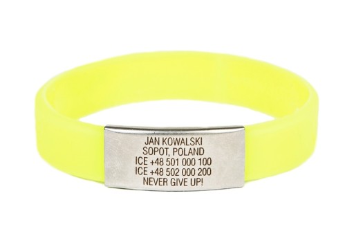 На браслет Slim можна помістити всі найважливіші дані, які можуть стати в нагоді в критичну хвилину. Вони будуть вигравірувані лазером на значку з нержавіючої сталі, тому вони надзвичайно міцні. В наявності 6 кольорів браслета Slim.