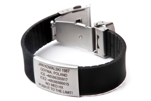 На ремінці ICEstripe Elite у вашому розпорядженні є 6 рядків тексту, де ви можете розмістити найважливішу інформацію про себе. Дані будуть вигравірувані лазером на значку з нержавіючої сталі.