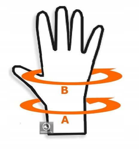 Розміри (по малюнку внизу), А - обхват зап'ястя, В - обхват руки.