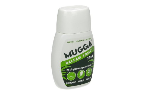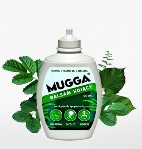- Заспокійливий бальзам Mugga® 50 мл - продукт, призначений для місцевого застосування. Швидко знімає біль і свербіж шкіри, викликані укусами комах, пекучою дією кропиви та медуз