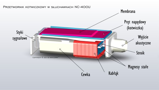Якірні перетворювачі зовні мають форму невеликої коробки з виходом, через який виходить звук. Всередині знаходяться постійні магніти, а в їх магнітне поле поміщений рухомий якір з намотаною котушкою. Коли через обмотку котушки не протікає струм, якір знаходиться в стабільному, або іншими словами, врівноваженому положенні - звідси походить англійська назва збалансований якір. Коли ми пропускаємо звуковий сигнал через котушку, якір починає вібрувати відповідно до сигналу. Якір постійно і жорстко з'єднаний зі стрижневим елементом - якорем (звідси польська назва) з дуже жорсткою мембраною, яка генерує звук. Цей звук виходить назовні через утворений отвір камери з мембраною. Арматурні перетворювачі - це рішення, яке використовується в основному у військовій техніці та в музичних навушниках класу hi-end. Вони цінуються в аудіосвіті завдяки дуже хорошому відтворенню звуку, малим розмірам і високій ефективності.