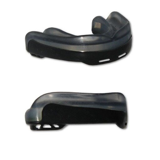Двошарова накладка на зуби в комплекті з коробкою. Міцний нижній шар гуми, з додатковою зоною амортизації для задніх зубів, верхній шар еластомеру - формується гарячою водою до форми зубів.