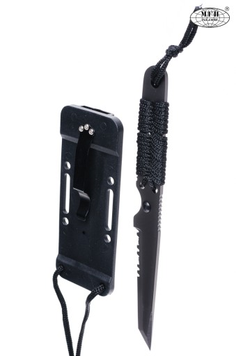 Виготовлена з нержавіючої сталі, оксидована. Дуже різкий і точний. Клинок типу TANTOO за зразком самурайських мечів. Лезо COMBO, частково зубчасте, дозволяє точно різати та брутально пиляти чи розривати. Зуби полегшують різання пластмаси, дерева, мотузок і текстилю, а також більш стійкі до затуплення. На тильній стороні леза є нековзкі виїмки для великого пальця, що полегшує виконання роботи, яка вимагає міцності. Зручна ручка, обмотана мотузкою, легка і зручна. Окислення усуває відблиски світла і додатково захищає від корозії. Носиться в плоскій кобурі з міцного матеріалу KYDEX. Піхви з перевіреним і регульованим захистом від мимовільного випадання з ножа. Чохли оснащені кліпсою для носіння на поясі - знімною (відкручується). Завдяки додатковим прорізам для кріплення стрічок і шнурів можна носити ніж прямо на руці, нозі або спорядженні. Велика ручка полегшує швидке та інстинктивне витягування ножа. Петля на зап'ясті не дає зловмиснику відібрати ніж.
