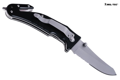 Міцний ніж для парамедиків. Продукт німецької компанії Mil-Tec. Модель, створена за суворими специфікаціями - надійна. Необхідне спорядження сучасного рятувальника. Незамінний в машині, дуже практичний. Компактні розміри, невелика вага та практичний затиск для кріплення полегшують транспортування. Торець ручки оснащений ломом для загартованого та клеєного скла. Лезо для швидкого розрізання ременів безпеки, кабелів і тросов.