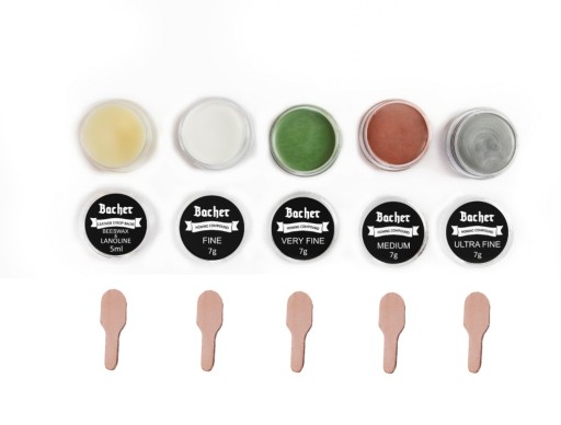 У набір вхідний шкіряний ремінь для полірування на дошку з бука з ручкою та можливість пі здвоювання інабору з чотирьох полірувальних пастз різною градацією.