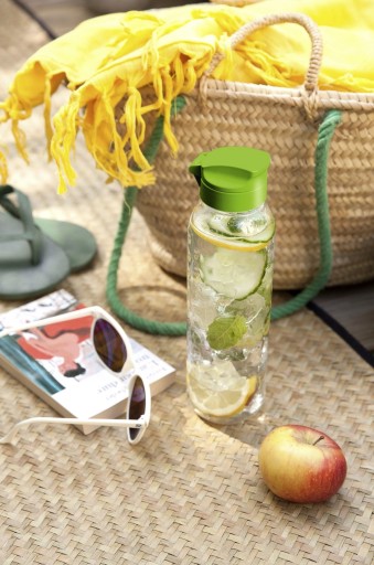 Пляшка об'ємом 450 мл виготовлена з прозорого тритану, що нагадує скло, стійке до пошкоджень, зміни кольору та неприємних запахів, що є ідеальним рішенням для любителів спорту та туризму. Щільна застібка дозволяє безпечно зберігати пляшку з водою в рюкзаку під час цілоденних велосипедних поїздок або тривалих походів, не турбуючись про розлиття вмісту та промокання цінного спорядження. Завдяки високій прозорості навіть звичайна мінералізована вода, збагачена різнокольоровими фруктами та травами, набуде виняткового смаку. Мірний стаканчик на зовнішній стінці полегшить точне відмірювання інгредієнтів, необхідних для отримання свіжого та корисного коктейлю.