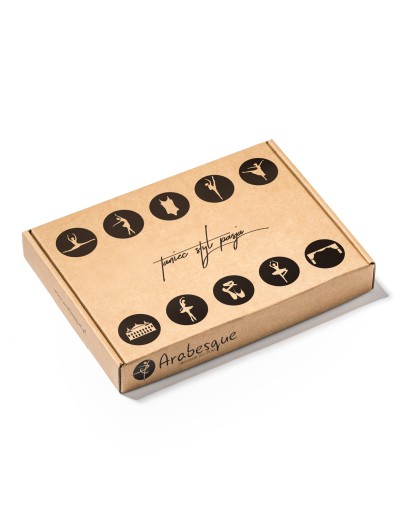 - Кожна деталь одягу упакована в картонну коробку з унікальним принтом з танцювальним акцентом.