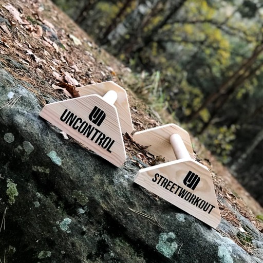 Професійні дерев’яні поручні/паралелі для занять спортом, стріт-воркауту та художньої гімнастики (набір з 2 шт.). Виготовлений дбайливо, естетично і завдяки підвищеній міцності. З одного боку напис UNCONTROL, з іншого – STREET WORKOUT.