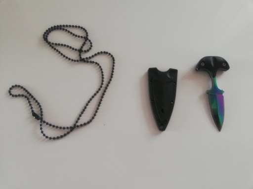 У комплект входить чохол з жорсткого пластику, який захищає ніж від випадкового випадання і втрати, і ланцюжок для підвішування на шию.