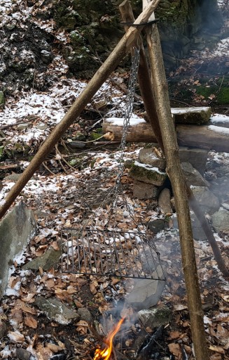 За допомогою кріплення можна спорудити над вогнищем триногу з наявних у лісі палиць і гілок.