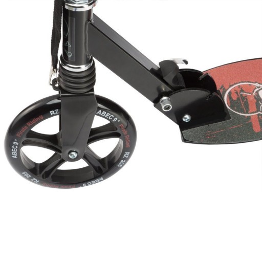 Складний самокат зі стильним написом «Pirate Riding» і цікавою кольоровою гамою подарує багато вражень, ідеальний супутник на коротких дистанціях. Скутер має поліуретанові колеса діаметром 205 мм і підшипники ABEC 9, що ідеально підходить для швидкої їзди.
