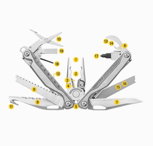Гладке лезо ножа, зубчасте лезо ножа, пилку та напилок можна відкрити без необхідності розгортати плоскогубці. Завдяки отворам для великого пальця леза ножа можна миттєво відкрити однією рукою. Ці 4 інструменти замикаються окремими фіксаторами вкладишів, інші взаємодіють із двома храповими замками, подібними до системи зворотного фіксатора.