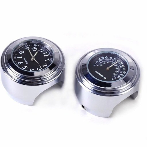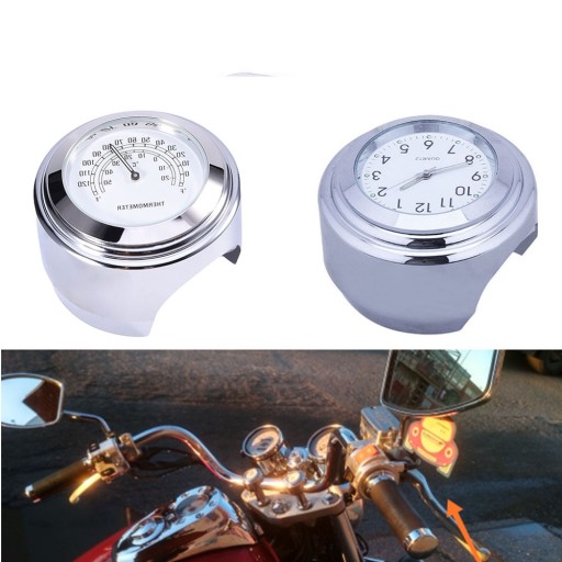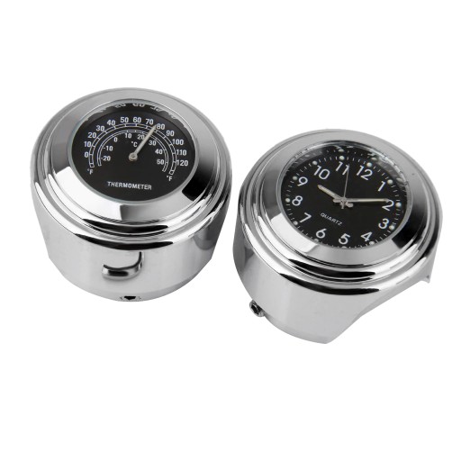 Елегантний хромований годинник і термометр практично для будь-якого керма. Поставляється з шестигранним ключем для встановлення та гумовим ременем на кермі.