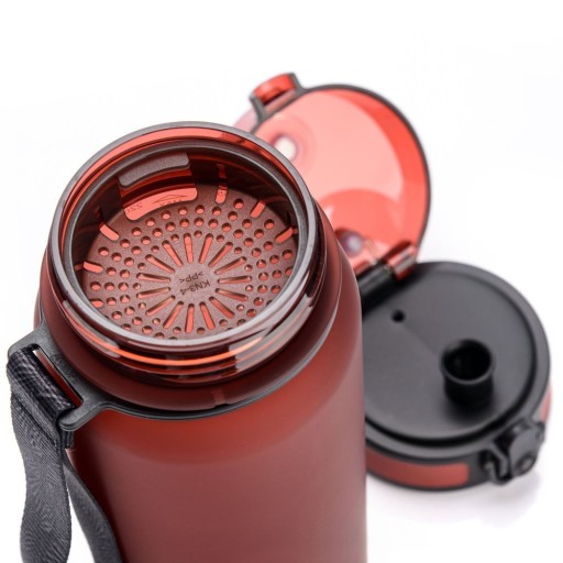 Пляшка має зручний ремінь на руку. Він закривається на замок, але відкривається легко і швидко одним дотиком. Завдяки спеціальному фіксатору кришки вам не доведеться турбуватися про випадкове розлиття напою.