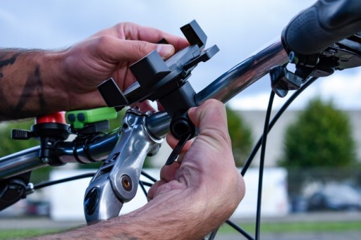 Щоб зібрати тримач, вам не знадобляться інструменти! Просто одягніть ремінь на кермо та вставте його у відповідний отвір. Сучасна система регулювання вражає своєю простотою! Щоб стабілізувати тримач на місці, просто затягніть ремінь гайкою, через яку він проходить! Поворотна головка також дозволяє розмістити телефон в горизонтальному положенні!