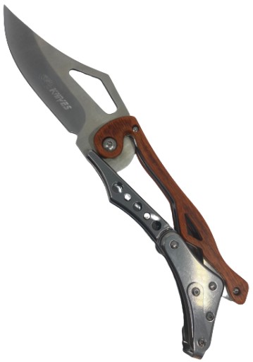 Лезо ножа виготовлено з нержавіючої сталі, рукоятка виготовлена з металу та дерева. Завдяки використаним матеріалам і кільцю, ніж надійно тримається в руці. Має фіксатор леза. На задній частині ручки є затискач для носіння на поясі. Ніж новий та гострий.