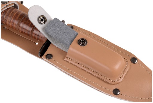 У комплект входить точильний камінь, який поміщається в невелику кишеню на передній частині піхви, застібається на застібку.