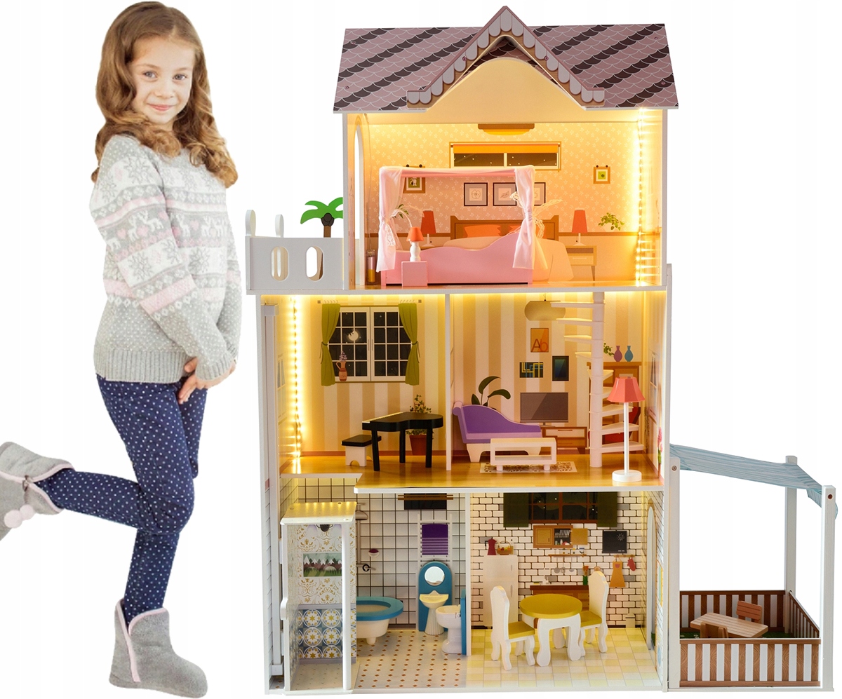 БОЛЬШОЙ ДЕРЕВЯННЫЙ КУКОЛЬНЫЙ ДОМИК + МЕБЕЛЬ + LED 120СМ